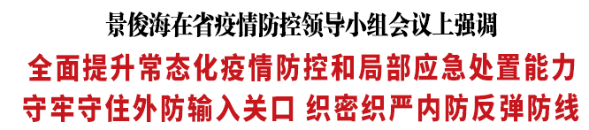 5月18日,省委书记景俊海以视频形式主持召开省疫情防控领导小组会议。他强调,要深入贯彻习近平总书记关于高效统筹疫情防控和经济社会发展的重要讲话重要指示精神,始终坚持人民至上、生命至上,坚持科学精准、动态清零,以“时时放心不下”的责任感抓紧抓实各项防控措施,全面提升常态化疫情防控和局部应急处置能力,守牢守住外防输入关口,织密织严内防反弹防线,坚决守住不发生规模性反弹底线。
