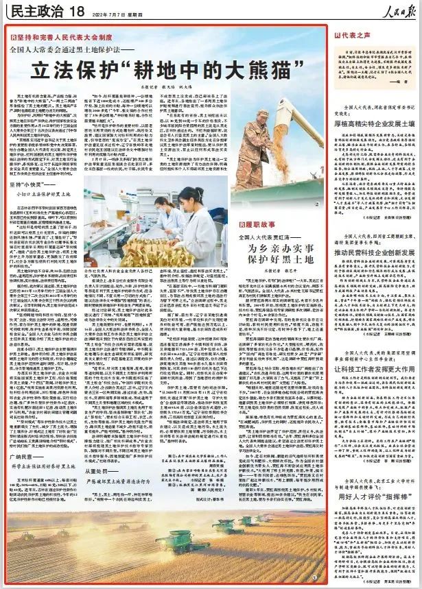 “贯彻落实习近平总书记关于黑土地保护的重要指示批示精神和党中央决策部署,结合办理全国人大代表有关议案,制定黑土地保护法,把利国惠民的黑土地特殊保护措施以法律的形式固定下来,对黑土地实行全面保护、系统修复,这对于长远保障国家粮食安全具有重要意义。”全国人大常委会法制工作委员会经济法室主任岳仲明介绍。