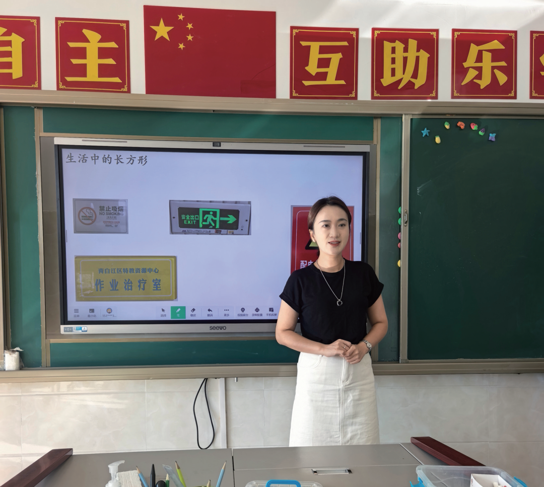 刘源浩每天面对的是一群特殊孩子,他们有的连吃饭、穿衣这样基础的生活技能也不会,为了让学生能够掌握独立生活和融入社会的能力,她倾注了全部的耐心和关爱。在教授学生学习遵守交通指示灯的课堂上,刘源浩运用情景模拟与实物教学法、动作与游戏结合法和生活化强化法等多种教学方法,并借助声光互动板、触感教具等多感官仪器,调动学生视、听、触等感知。可能在普通学校一句话能带过的知识点,在这里则需要教上一星期、一个月甚至是一年,但她从来都是耐心教授每一个孩子。教室里,每一声含糊的“老师好”,每一次笨拙却坚定的举手,都藏着孩子们对世界最纯粹的渴望。