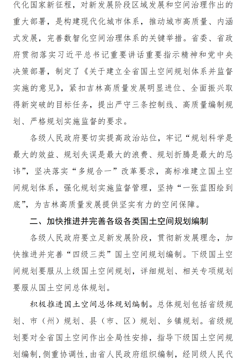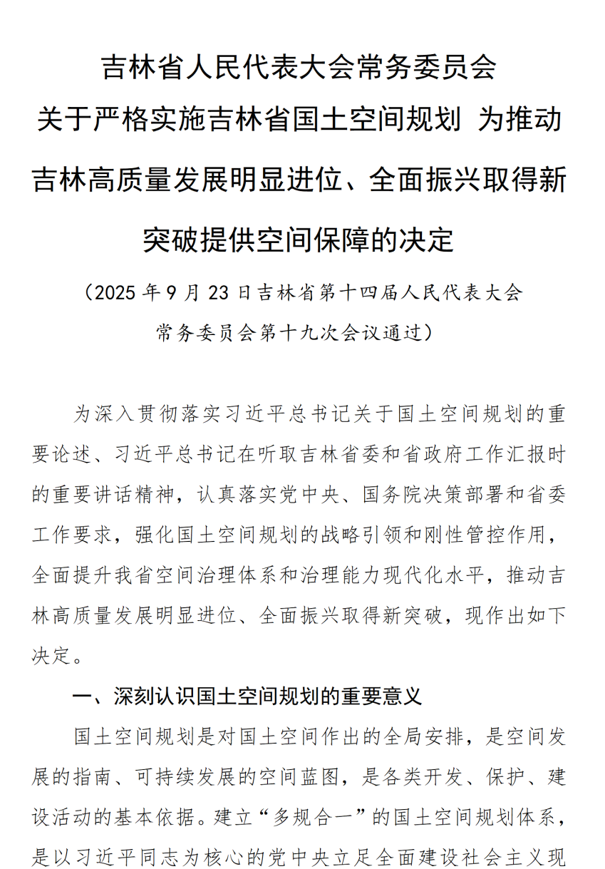吉林省人民代表大会常务委员会关于严格实施吉林省国土空间规划 为推动吉林高质量发展明显进位、全面振兴取得新突破提供空间保障的决定