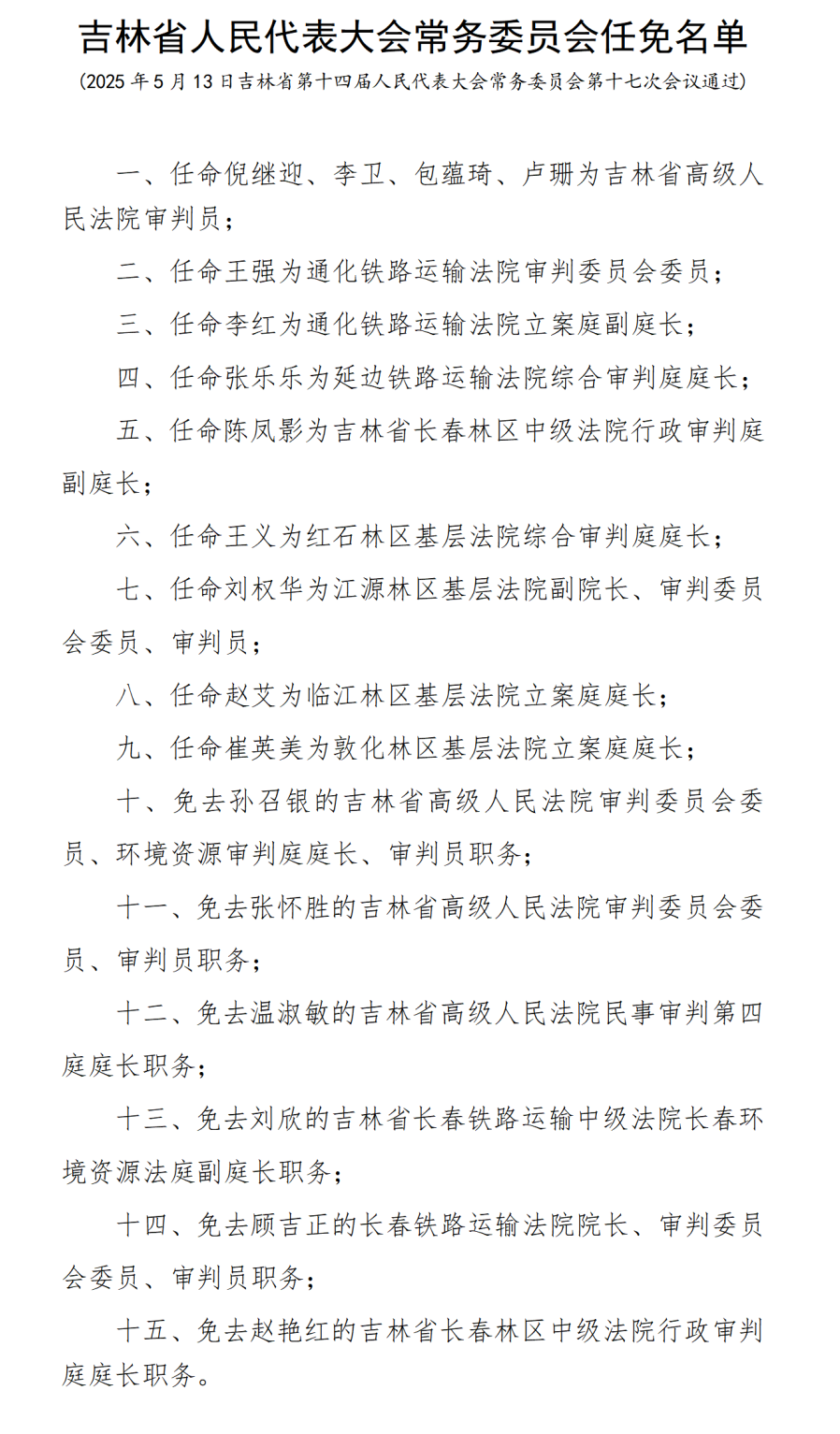 吉林省人民代表大会常务委员会任免名单