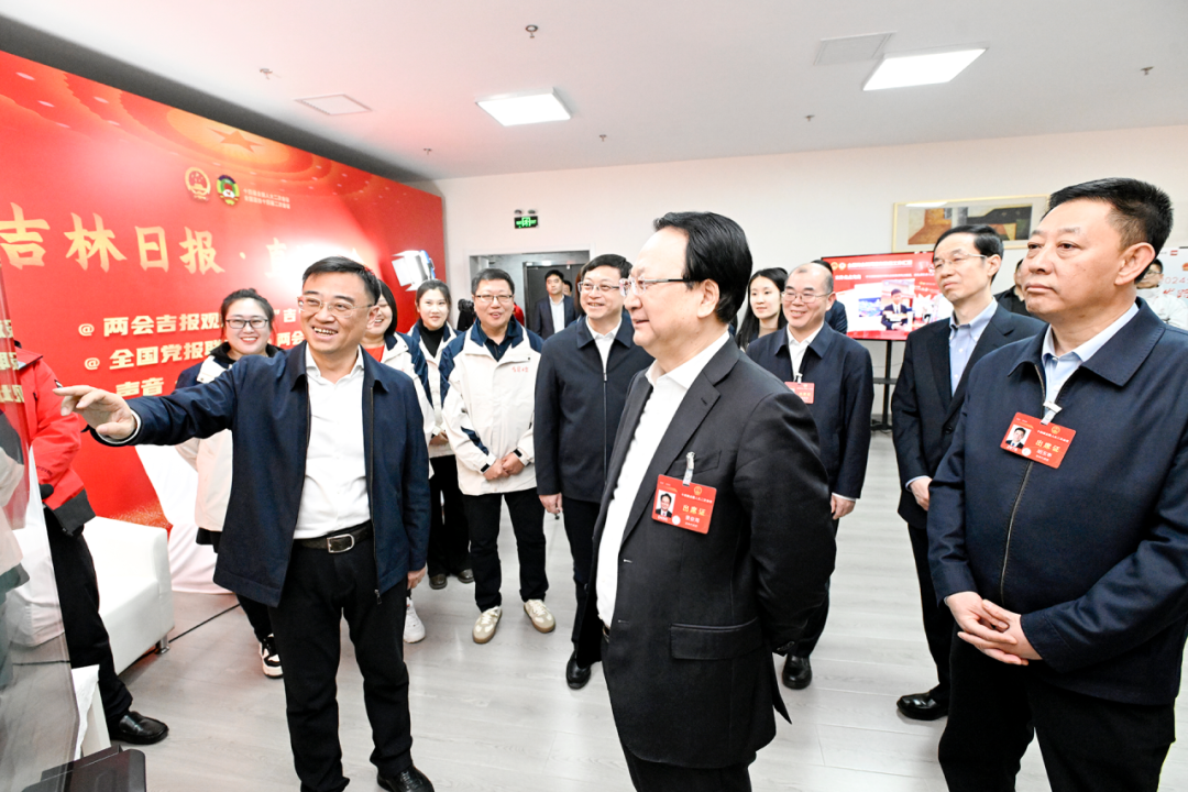 3月9日,省委书记、省人大常委会主任景俊海,省委副书记、省长胡玉亭,省政协主席朱国贤到省直新闻单位全国两会报道团队驻地,实地察看吉林日报、吉林广播电视台、中国吉林网前方工作室和演播平台,详细了解新闻报道采编刊播等制作流程。