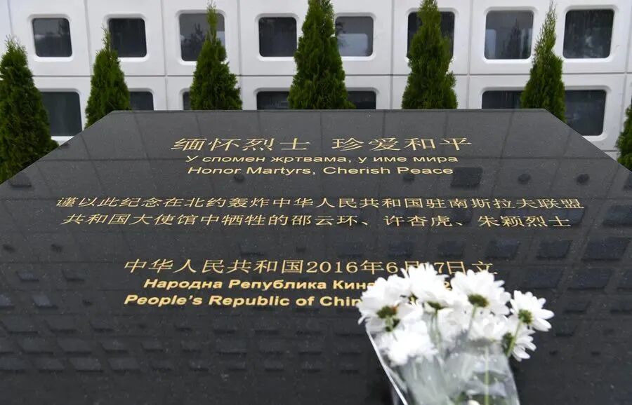 中国国家元首亲临被炸使馆旧址凭吊英烈,打动国人心。镌刻“缅怀烈士 珍爱和平”的碑石竖立在异国土地上,涵义深远。