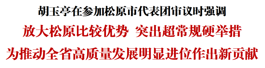 1月14日,胡玉亭代表到松原市代表团参加审议。他强调,要贯彻落实党的二十届三中全会精神,按照中央经济工作会议和省委全会部署,锚定全年目标任务,坚定信心、找准定位、突出优势、强化执行,项目化工程化抓好《政府工作报告》落实,为推动吉林高质量发展明显进位、全面振兴取得新突破,作出松原应有贡献。蔡东、刘伟参加审议。