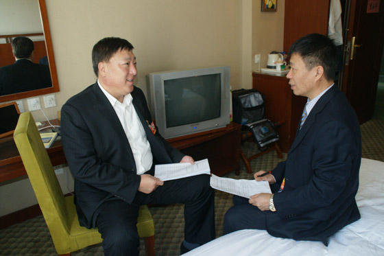 连续当选三届省人大代表的董安华十分关注社区街道工作人员的生活状况,会议前夕,他专门为此深入临江市多个社区进行调研,并精心撰写了一份建议。图为董安华代表正在征求会务组工作人员意见。