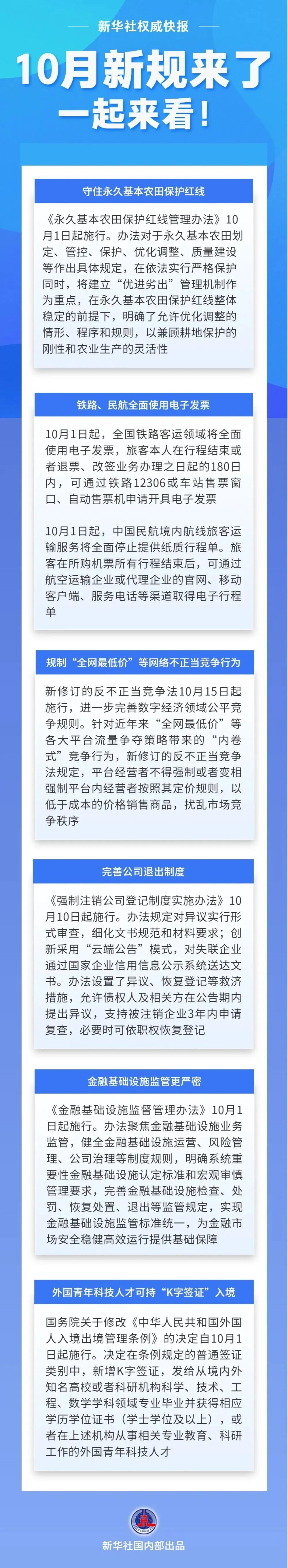 新办法守住永久基本农田保护红线;铁路、民航10月1日起全面使用电子发票;新修订的反不正当竞争法规制“全网最低价”等网络不正当竞争行为……10月新规来了,一起来看!