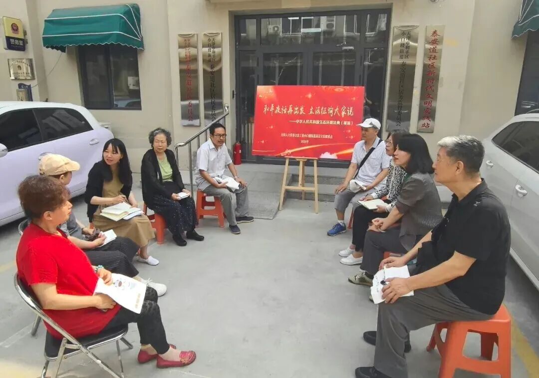 “和平夜话再出发,立法征询大家说”——2025年5月,天津小白楼街道基层立法联系点到社区征集对生态环境法典草案的意见。(全国人大常委会法工委基层立法联系点办公室供图)