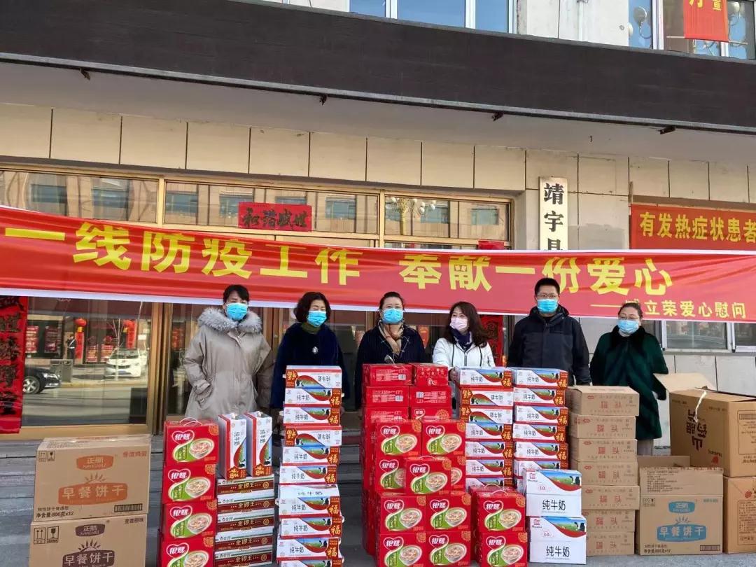 市人大代表、靖宇县荣兴包装有限公司总经理臧立荣为辛苦奉献在一线的工作人员送去了价值6000多元的物资,解决他们一日三餐的苦恼。