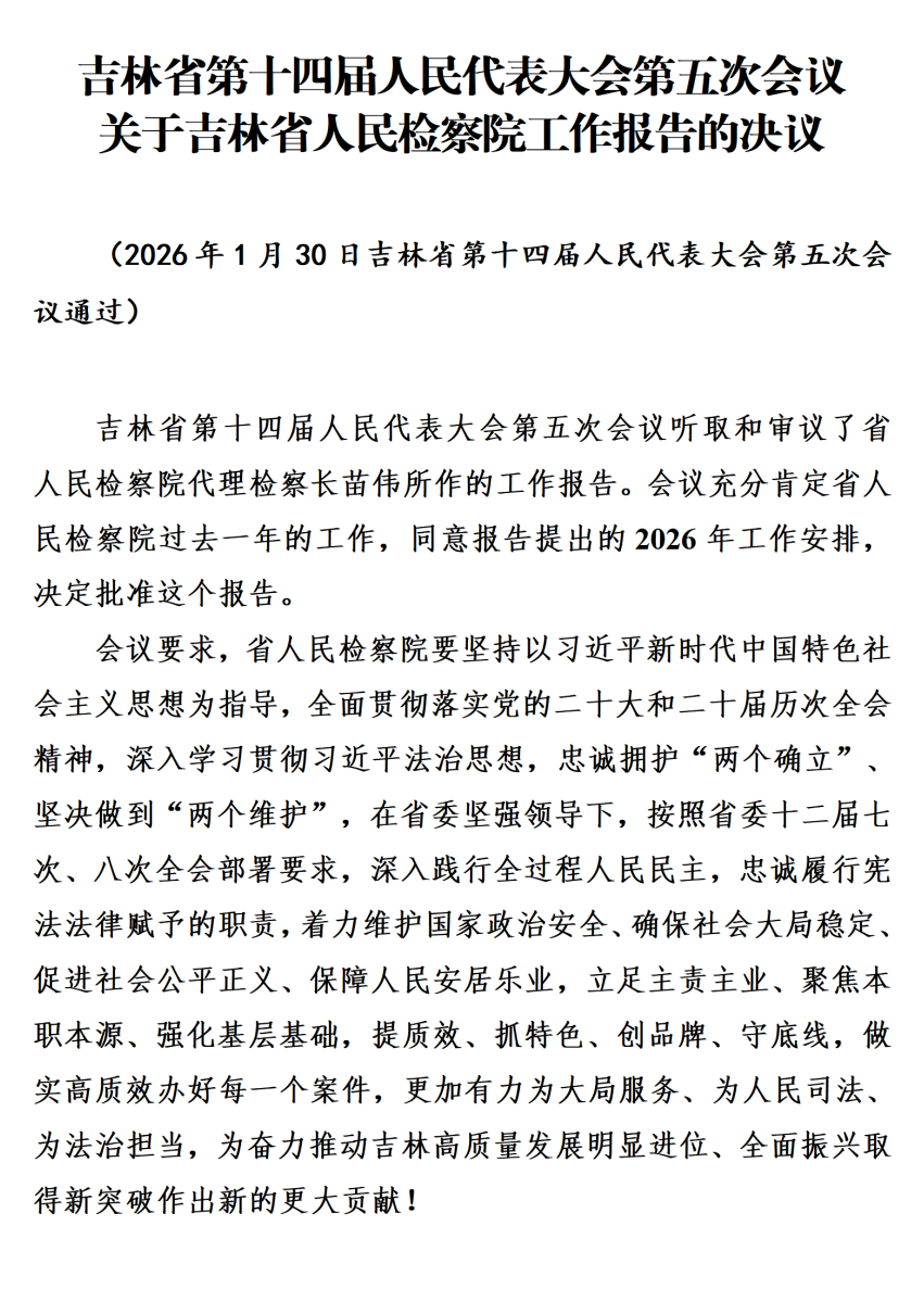 吉林省第十四届人民代表大会第五次会议关于吉林省人民检察院工作报告的决议