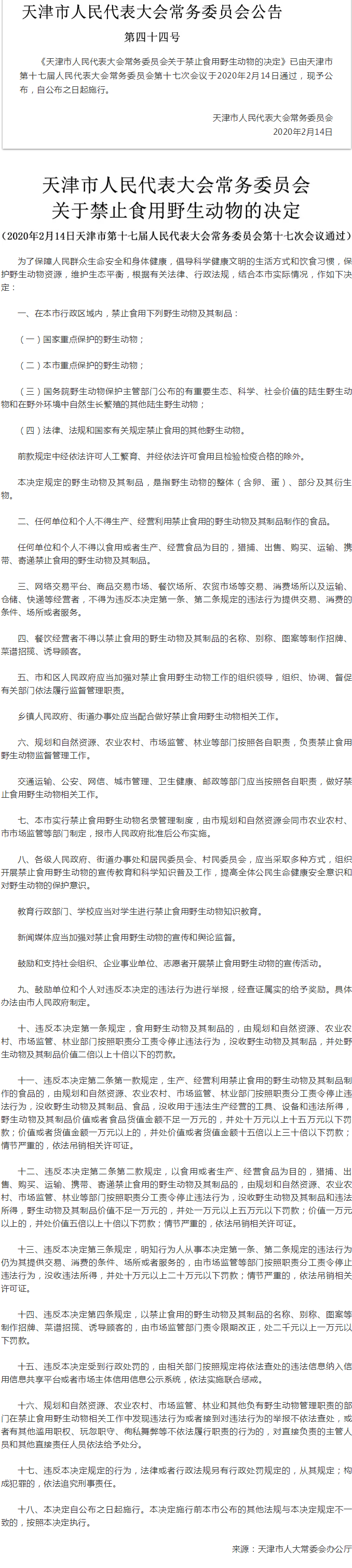 天津市人大常委会关于禁止食用野生动物的决定