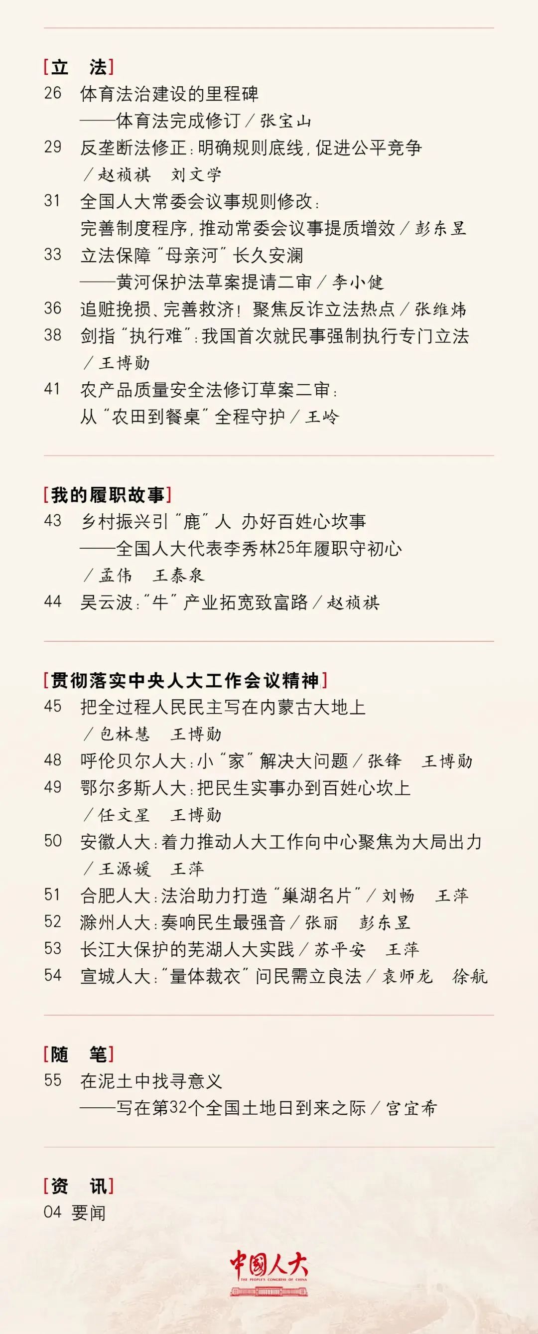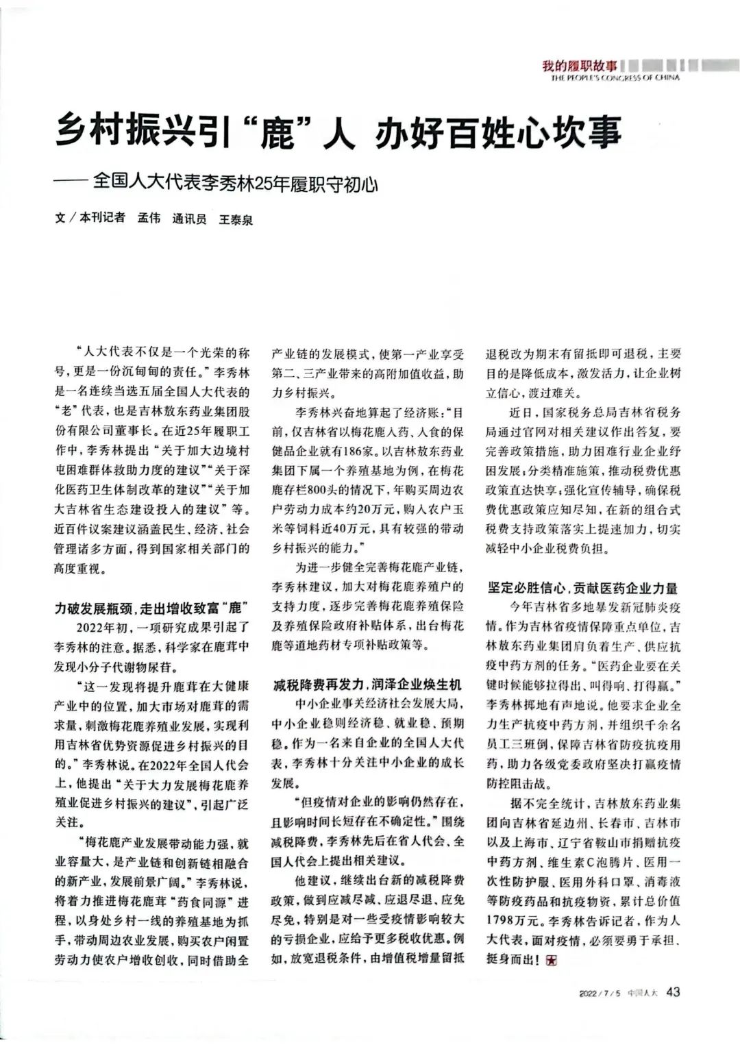 2022年7月5日出版的第13期《中国人大》杂志在“我的履职故事”专栏中以《乡村振兴引“鹿”人,办好百姓心坎事》为题报道了我省全国人大代表、吉林敖东药业集团股份有限公司董事长李秀林担任全国人大代表25年来,秉承初心、牢记使命、竭诚履职的感人事迹。