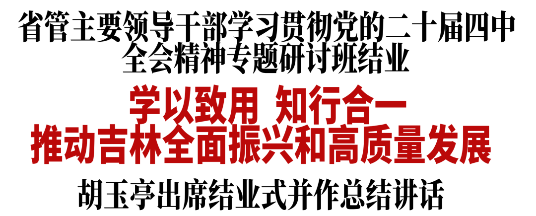 胡玉亭指出,在全省深入贯彻党的二十届四中全会精神,奋力推动吉林高质量发展明显进位、全面振兴取得新突破的关键时期,省委举办专题研讨班,黄强书记出席开班式并作动员讲话,发出了奋进“十五五”的“动员令”。要把思想和行动统一到党中央的决策部署上来,深化对制定和实施五年规划是重要政治优势的认识,坚定制度自信、增强历史主动,忠诚拥护“两个确立”、坚决做到“两个维护”。把握“十五五”时期阶段性特征、阶段性要求,保持定力、精心运筹,做到该为的必须为、能为的努力为、不该为的决不为。强化维护国家“五大安全”的责任担当,推动高质量发展和高水平安全良性互动。要超常规发力、创造性执行,推动经济实现质的有效提升和量的合理增长。凝聚克难攻坚共识,找准目标定位,加快补考赶考,在中国式现代化建设中展现“吉林作为”。