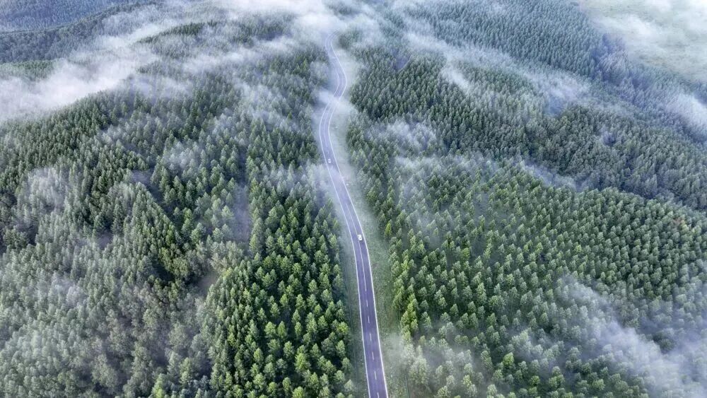 2024年7月26日拍摄的塞罕坝国家级自然保护区景色(无人机照片)。夏日清晨,位于河北省承德市的塞罕坝国家级自然保护区满目青翠,浩瀚林海壮美如画。新华社发(王立群 摄)