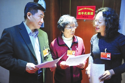 参加省十二届人大五次会议的代表汇聚一堂,讨论、修改各自的建议。 摄/钱文波